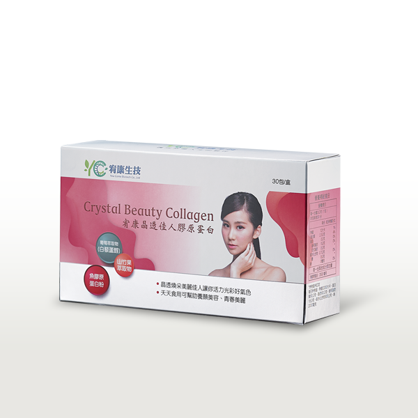 晶透佳人膠原蛋白主要複方元素有魚膠原蛋白、山竹果萃取、白藜蘆醇等,讓您的肌膚水噹噹閨密都羨慕,由內而外散發自信光彩。宥康生技─營養補給食品專家,只要產品包括龜鹿鱘駝養生晶凍、歐米加369軟膠囊、固力勇軟膠囊、極品御樟芝素食膠囊、黑鑽馬卡素食膠囊、胺基酸螯合鈣、極品御樟芝褐藻萃取液、晶透佳人膠原蛋白、菲立淨膠囊、 Lesaffre酵母B群植物膠囊、舒明亮軟膠囊、宥芯安植物膠囊、美纖酵素益生菌、美麗人生軟膠囊 、衛常樂軟膠囊、臻天然草本醱酵液。