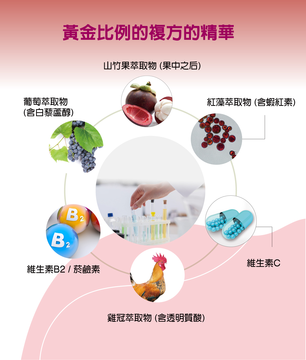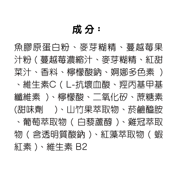 魚膠原蛋白粉、麥芽糊精、蔓越莓果汁粉(蔓越莓濃縮汁、麥芽糊精、紅甜菜汁、香料、檸檬酸鈉、婀娜多色素)、維生素C(L-抗壞血酸、羥丙基甲基纖維素)、檸檬酸、 二氧化矽、蔗糖素(甜味劑)、山竹果萃取物、菸鹼醯胺、葡萄萃取物(白藜蘆醇)、雞冠萃取物(含透明質酸鈉)、紅藻萃取物(蝦紅素)、維生素B2