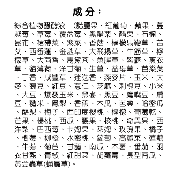 綜合植物醱酵液(諾麗果、紅葡萄、蘋果、蔓越莓、草莓、覆盆莓、黑醋栗、醋栗、石榴、昆布、裙帶菜、 紫菜、香菇、檸檬馬鞭草、苦艾、西番蓮、金盞草、大飛揚草、牛筋草、檸檬草、大茴香、馬黛茶、魚腥草、紫蘇、 薰衣草、貓薄荷、洋甘菊、生薑、益母草、芭樂葉、丁香、咸豐草、迷迭香、燕麥片、玉米、大麥、豌豆、紅豆、 薏仁、芝麻、刺槐豆、小米、大豆、爆裂玉米、黑麥、黑豆、鷹嘴豆、扁豆、糙米、鳳梨、香蕉、木瓜、芭樂、哈密瓜、 酪梨、梅子、西印度櫻桃、檸檬、葡萄乾、芒果、楊桃、西瓜、腰果、核桃、奇異果、西洋梨、巴西莓、卡姆果、萊姆、 玫瑰果、橘子、樹莓、柳橙、水蜜桃、蘿蔔、高麗菜、蓮藕、牛蒡、菊苣、甘藷、南瓜、木薯、番茄、羽衣甘藍、青椒、 紅甜菜、胡蘿蔔、長型南瓜、黃金蟲草(蛹蟲草))。