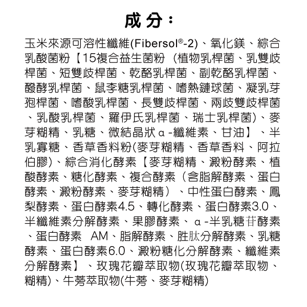 玉米來源可溶性纖維 (Fibersol®-2)、氧化鎂、綜合乳酸菌粉 (植物乳桿菌、乳雙歧桿菌、短雙歧桿菌、乾酪乳桿菌、副乾酪乳桿菌、 醱酵乳桿菌、鼠李糖乳桿菌、嗜熱鏈球菌、凝乳芽孢桿菌、嗜酸乳桿菌、長雙歧桿菌、兩歧雙歧桿菌、乳酸乳桿菌、羅伊氏乳桿菌、瑞士乳桿菌、麥芽糊精、乳糖、微結晶狀α-纖維素、甘油)、 半乳寡糖、香草香料粉 (麥芽糊精、香草香料、阿拉伯膠)、綜合消化酵素【麥芽糊精、澱粉酵素、植酸酵素、糖化酵素、複合酵素(含脂解酵素、蛋白酵素、澱粉酵素、麥芽糊精)、 中性蛋白酵素、鳳梨酵素、蛋白酵素 4.5、轉化酵素、蛋白酵素 3.0、半纖維素分解酵素、果膠酵素、α-半乳糖苷酵素、蛋白酵素 AM、脂解酵素、胜肽分解酵素、乳糖酵素、蛋白酵素 6.0、 澱粉糖化分解酵素、纖維素分解酵素】、玫瑰花瓣萃取物 (玫瑰花瓣萃取物、糊精)、牛蒡萃取物 (牛蒡、麥芽糊精)。
