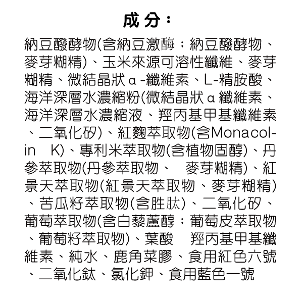 納豆醱酵物 (含納豆激酶;納豆醱酵物、麥芽糊精)、玉米來源可溶性纖維、麥芽糊精、微結晶狀α- 纖維素、L-精胺酸、 海洋深層水濃縮粉 (微結晶狀α纖維素、海洋深層水濃縮液、羥丙基甲基纖維素 、二氧化矽)、紅麴萃取物 (含Monacolin K)、 專利米萃取物 (含植物固醇)、丹參萃取物 (丹參萃取物、 麥芽糊精)、紅景天萃取物 (紅景天萃取物、麥芽糊精)、 苦瓜籽萃取物 (含胜肽)、二氧化矽、葡萄萃取物 (含白藜蘆醇;葡萄皮萃取物、葡萄籽萃取物)、葉酸。
